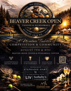 Presented by Beaver Creek Tennis & Pickleball Center, Stephanie Hart in partnership with LIV Sotheby’s International Realty, and the Vail Valley Charitable Fund, the 2nd Annual Beaver Creek Open will take place on August 7th and 8th and welcomes tennis and pickleball players and spectators alike for competition, connection, and community! This event will host over 144 players of all ability levels and include a semi-pro tournament with $1,500 in prize money, a silent auction, and a celebratory reception with food, beverages and live music. Registration details coming soon.